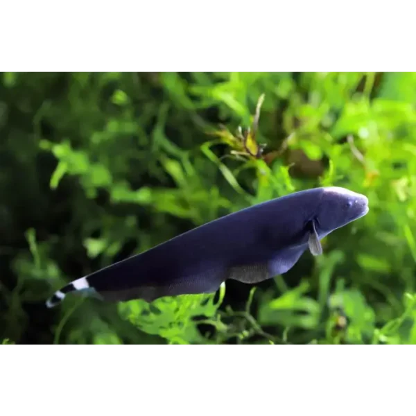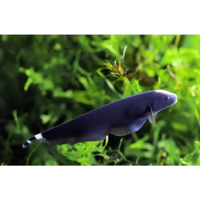 This species, Apteronotus albifrons, comes from South America where it inhabits dimly lit rivers and streams. It’s a nocturnal, weakly electric fish that uses electric signals to navigate and locate food. Because of its size and sensitivity, the Black Ghost Knife 22/27cm is best kept by intermediate to advanced aquarists who can provide a suitably large, stable aquarium.