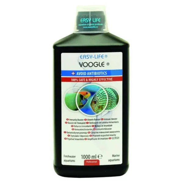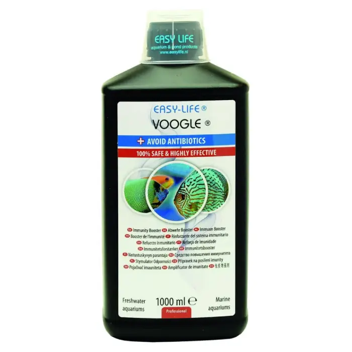 Voogle is a natural fish health treatment developed by Easy Life to boost the immune system of aquarium fish. It helps fish recover from infections, diseases, and wounds by enhancing their resistance to pathogens like bacteria, fungi, and parasites. Since it’s based on natural plant extracts and vitamins, it’s considered safe for fish, shrimp, and plants and doesn’t harm the biological filter in the aquarium.