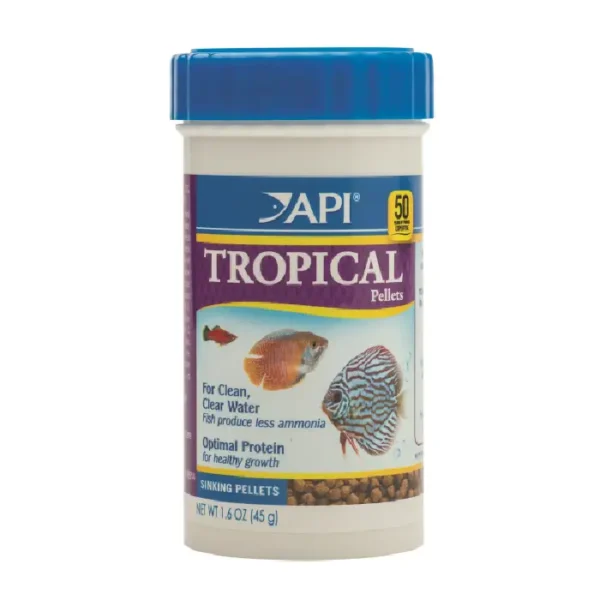 API Tropical Pellet Food 45g is a high-quality sinking pellet for tropical community fish—supporting vibrant colour, strong immune systems, and cleaner water in smaller aquariums.