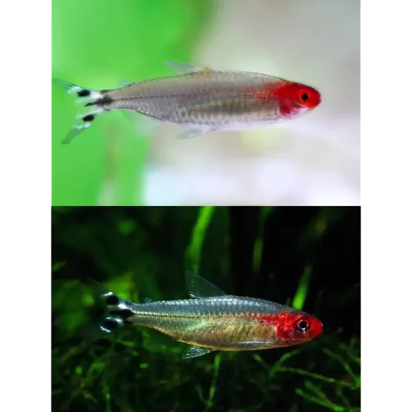 Brilliant Rummy Nose 3cm (Hemigrammus bleheri) is a striking schooling tetra known for its vivid red nose and bold black‑and‑white tail pattern. At around 3cm, Brilliant Rummy Nose 3cm are perfect for planted community tanks, where their tight schooling behaviour and colour make them a standout mid‑water feature.
