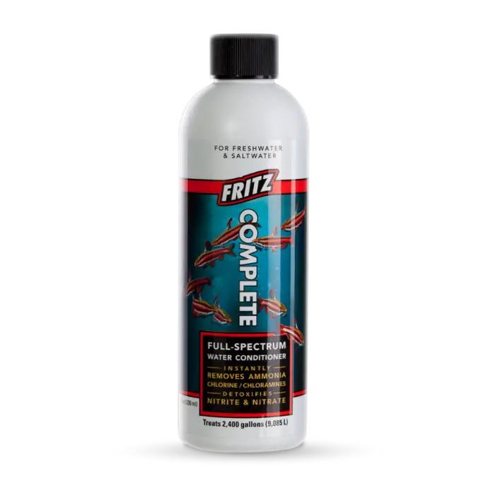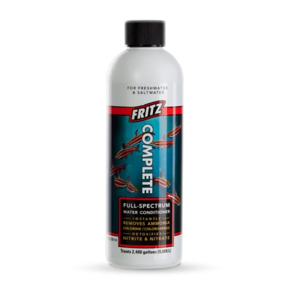 Fritz Complete is a concentrated, one-step, full-spectrum water conditioner that detoxifies chlorine, chloramine, heavy metals,ย ammonia, nitrite and nitrate. Safe to use in fresh and saltwater, including reef and planted aquariums. Use when setting up new aquariums, performing water changes or to quickly alleviate high ammonia, nitrite and nitrate.