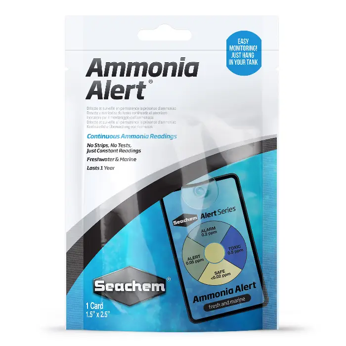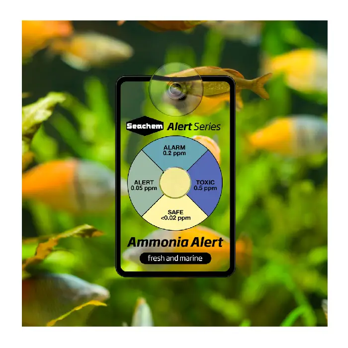 Ammonia Alert® is an innovative color device for continuously detecting and monitoring toxic free ammonia. A sensor changes reversibly from yellow to green to blue, relative to the ammonia concentration. No test kits, chemicals, or procedures are needed. The device detects less than 0.05 mg/L (ppm) free ammonia and alerts you to the #1 killer before any sign of stress. It lasts over a year. This product is not recommended for use at acid pH. Marine or freshwater use.