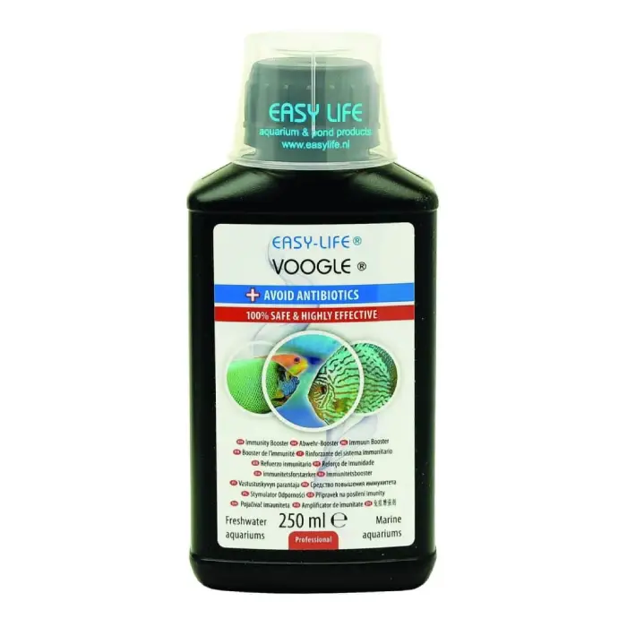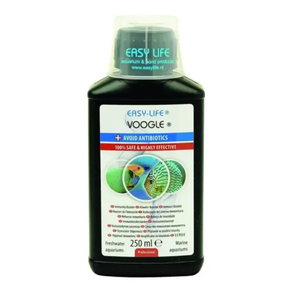 Easy-Life Voogle 250ml is a natural fish health treatment developed by Easy-Life to support the immune system of aquarium fish. Rather than acting like a harsh medication, Easy-Life Voogle 250ml strengthens the fishโs own defences so they can better fight off bacteria, fungi and parasites.
