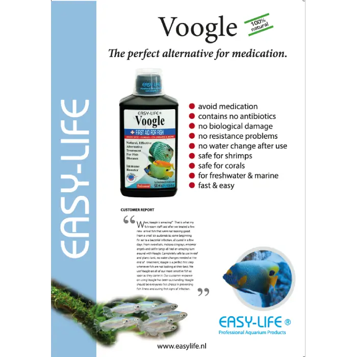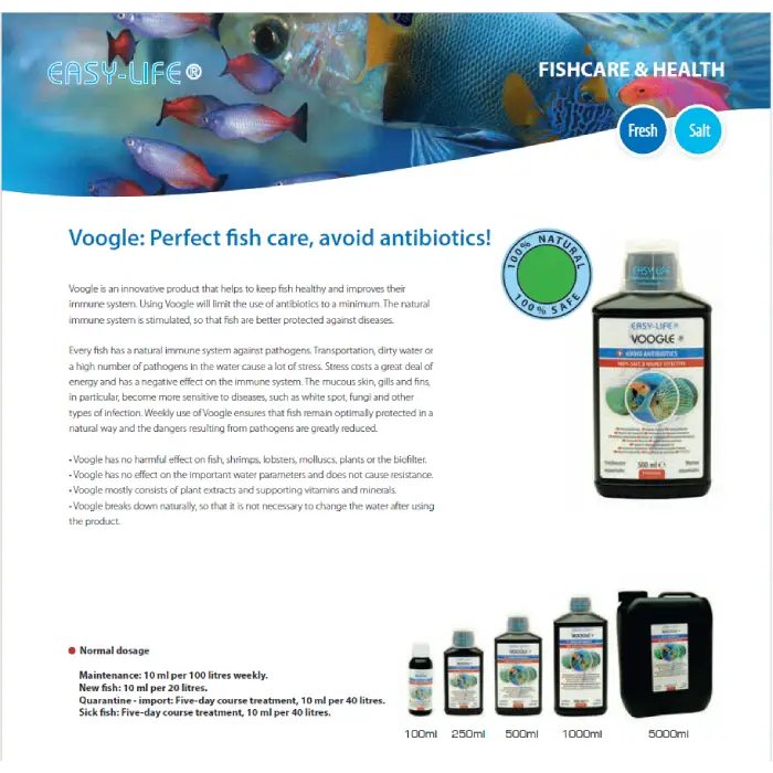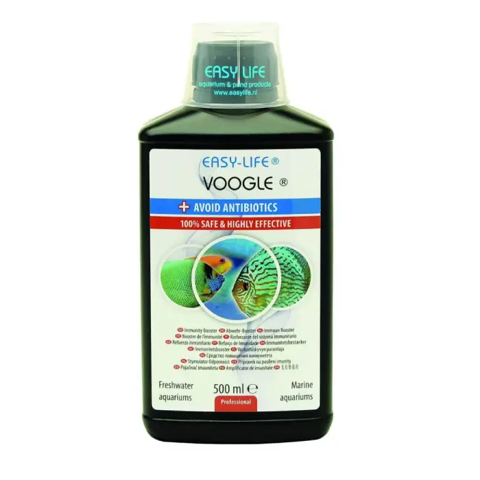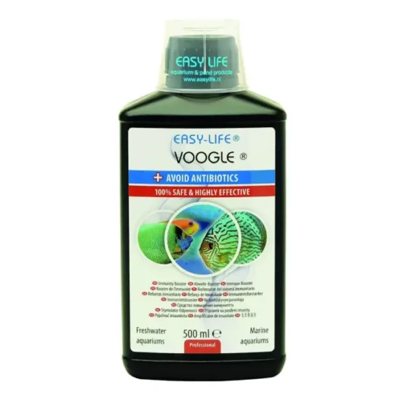 Voogle is a natural fish health treatment developed by Easy Life to boost the immune system of aquarium fish. It helps fish recover from infections, diseases, and wounds by enhancing their resistance to pathogens like bacteria, fungi, and parasites. Since it’s based on natural plant extracts and vitamins, it’s considered safe for fish, shrimp, and plants and doesn’t harm the biological filter in the aquarium.